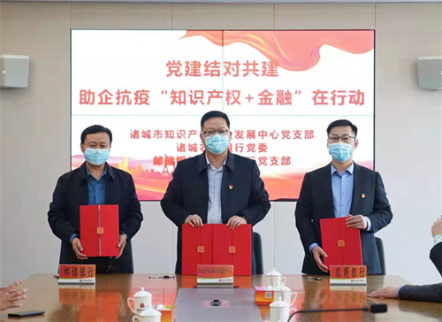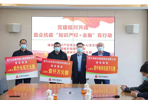 疫情当前,重任在肩。为认真落实市委疫情防控部署要求,充分发挥党组织战斗堡垒作用和党员先锋模范作用,确保人民群众生命健康安全、助力企业健康快速发展,进一步扩大知识产权质押融资的带动和示范效应,激活企业发展新动能,按照“党委牵头、支部联动、资源共享、优势互补、共推共赢”的工作思路,做到防控、发展两不误,为中小企业减负,特开展党建共建、助企抗“疫”“知识产权+金融”行动。由市知识产权事业发展中心牵头,联合诸城农商行、邮储银行三方党组织“共建”,充分发挥双方职能优势,汲取党建智慧,开展专利质押融资,助力企业发展,推动各项业务工作再上新台阶,按照“部门引领、企业参与、市场主导”的方式方法,进一步探索知识产权质押融资新模式,帮助企业实现“知产”变“资产”,为企业发展提供资本支持。推行发明专利贷款新品种,通过“党建引领、资源整合、专利先行、资金跟进”,1-2月份发放质押融资贷款5720万元,为拥有发明专利的创新型企业送上“及时雨”,切实解决创新型企业融资难题,支持企业发展,助力乡村振兴,深化“诸城模式”,共同打赢这场疫情防控阻击战。