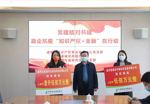 此次党建结对共建仪式由诸城市农商银行党委委员副行长李亮主持,共三项议程,一是知识产权事业发展中心党支部分别与诸城市农商银行党委和邮政储蓄银行诸城支行党支部签署《党建结对共建协议》;二是市知识产权事业发展中心分别与诸城市农商银行、邮政储蓄银行诸城支行签署《合作备忘录》;三是由诸城市农商银行和邮政储蓄银行诸城市支行分别为企业颁发授信牌。